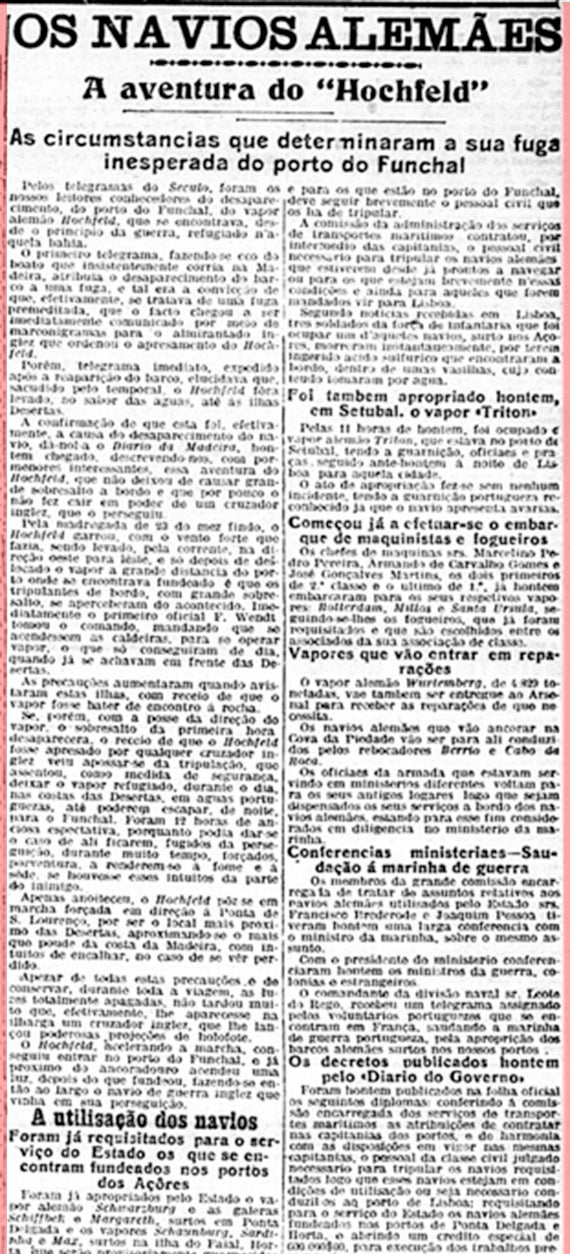 No Funchal sucedeu um episódio curioso, igualmente relatado nos jornais da época: um navio alemão, aparentemente, fugiu ao apresamento, levantando ferro durante a noite e deixando mesmo o seu capitão em terra. “Fugiu”, concluíam os jornais. Mas a história não foi bem essa e a verdade do que sucedeu ao Hochfeld foi depois reposta, neste caso pelo jornal O Século.