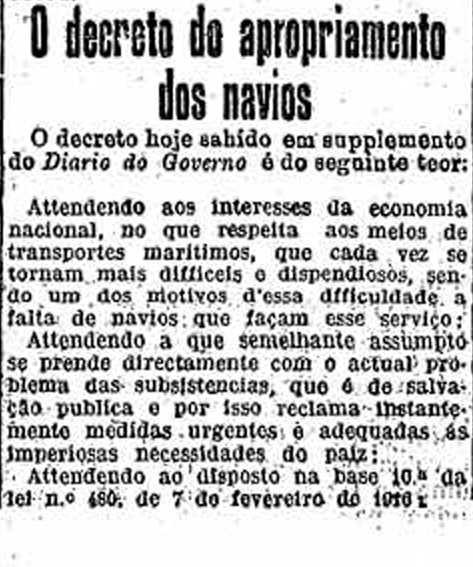 O decreto que autorizava a requisição dos navios, assinado no próprio dia 23 de manhã, invocava “os interesses da economia nacional, no que respeita aos meios de transportes marítimos”.
