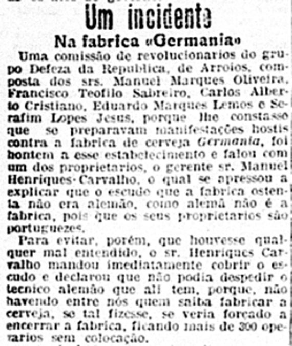 Para evitar, porém, que houvesse qualquer mal-entendido, o Sr. Henriques Carvalho mandou imediatamente cobrir o escudo e declarou que não podia despedir o técnico alemão que ali tem, porque, não havendo quem saiba fabricar a cerveja, se tal fizesse, se veria forçado a encerrar a fábrica, ficando mais de 300 operários sem colocação.