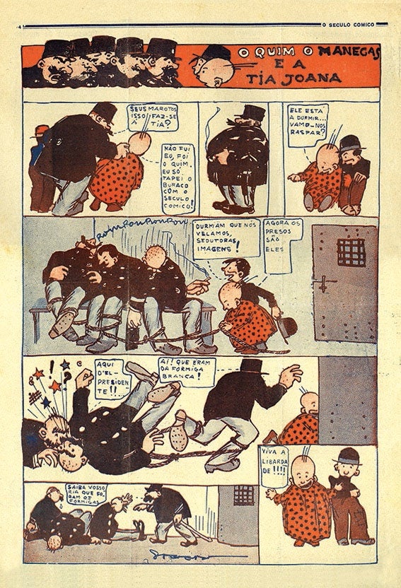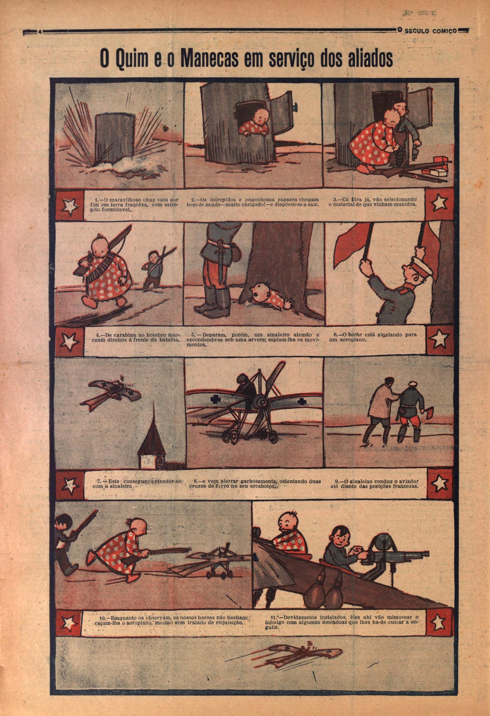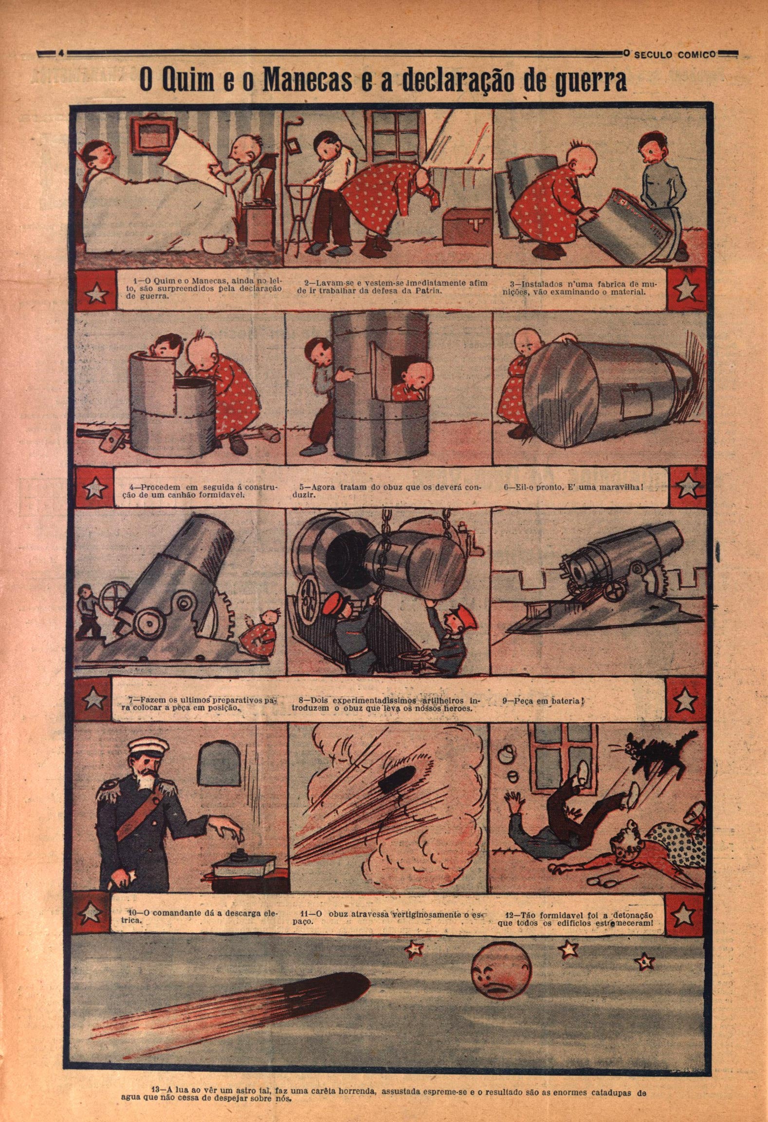 A saga dos irmãos “Quim e Manecas e a declaração de guerra”, aqui reproduzida, surgiu nas edições d’O Século Cómico nos dias 23 e 30 de março de 1916.