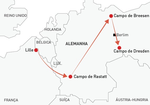 Mas a certa altura, foram levados para Breesen. Breesen no norte da Alemanha perto de Hamburgo na zona do mar báltico, lá para cima. Essa viagem o meu pai não a conta no livro. Mas a nós dizia-nos que foram vários os meios de transporte a pé, de comboio, recebendo ordens que nem percebiam, sem alimento, alguns chegaram a perder 20 quilos. Um deles enlouqueceu, houve um que morreu, antes de chegarem a Brisen. E tudo sem notícias. Não tinham notícias, nem havia notícias deles em Portugal, nem eles tinham notícias de Portugal.