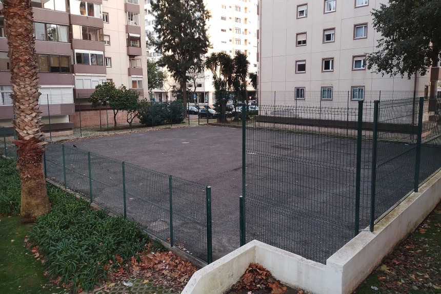 O espaço está alcatroado e vedado por redes, mas não tem qualquer tipo de equipamento desportivo ou de lazer.
