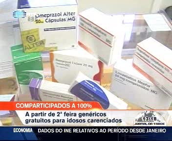 A partir de segunda-feira, os medicamentos genéricos vão ser comparticipados a 100 por cento para os pensionistas com rendimentos inferiores ao salário mínimo nacional. O Governo diz que a medida vai abranger para cima de um milhão de pessoas. Para a generalidade da população, os medicamentosos do escalão A já são comparticipados em noventa e cinco por cento pelo Estado.