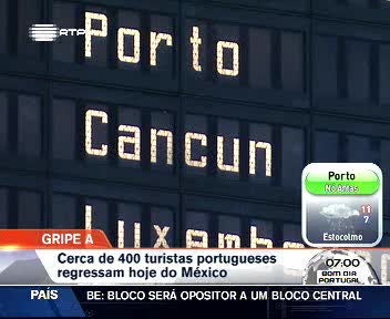 Vinte e quatro horas depois de as autoridades portuguesas terem confirmado o primeiro diagnóstico de Gripe A no país, o Aeroporto da Portela recebe mais de 300 turistas que estiveram a gozar férias na estância turística mexicana de Cancún. Um primeiro voo, assegurado pela transportadora White, viaja directamente do México para Lisboa com 257 turistas portugueses a bordo. A segunda ligação pertence à companhia Orbest e traz mais 100 pessoas do México, partindo da República Dominicana - alguns dos turistas que estiveram neste país terão protestado contra a partilha do voo.
