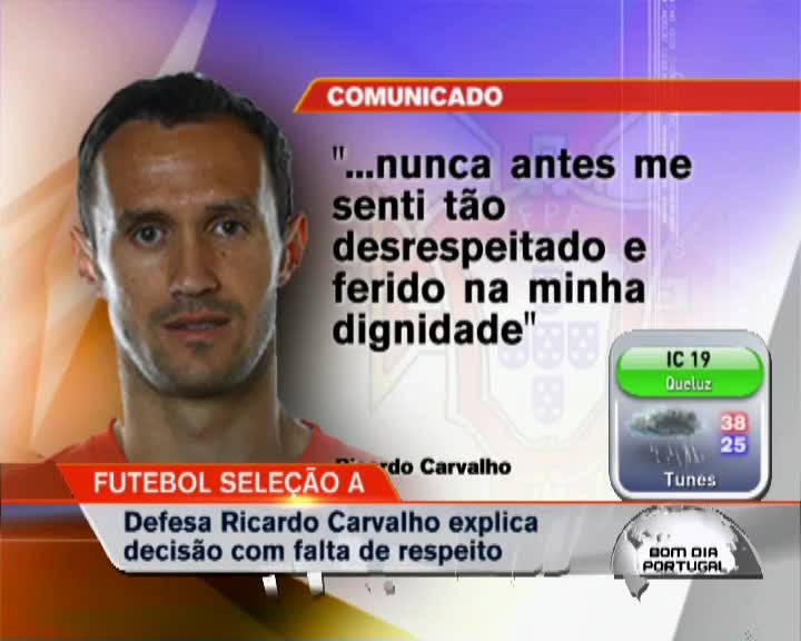 Ricardo Carvalho já explicou as razões para ter renunciado à selecção.O jogador diz que se sentiu "desrespeitado e ferido" na dignidade. O defesa central do Real Madrid diz que se o fazem sentir a mais e não o dizem, a única possibilidade é a saída. O jogador não gostou de saber que não era titular de Portugal no jogo com o Chipre. Ricardo Carvalho lamenta ainda ter terminado de forma polémica um percurso com 75 internacionalizações.