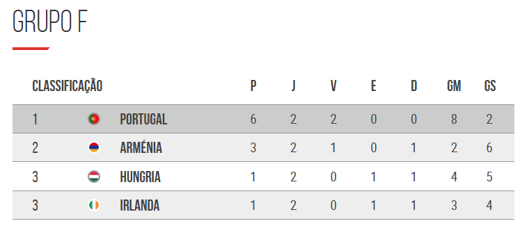 Portugal faz parte do grupo F do qual fazem parte também a Arménia, a Hungria e a República da Irlanda.