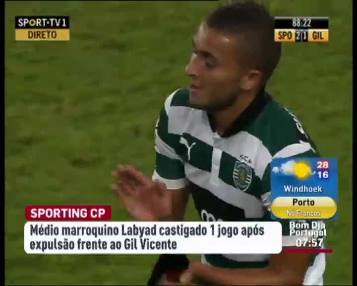 Labyad foi suspenso por um jogo. O jogador marroquino do Sporting foi expulso nos últimos minutos do jogo com o Gil Vicente por acumulação de cartões amarelos. A decisão foi já contestada pelo Sporting.