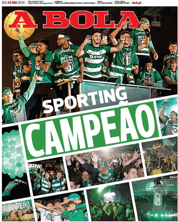 Os três jornais desportivos são unânimes no tema, com A Bola a titular “Sporting campeão”, e O Jogo a escrever: “Verde, claro! Sporting aproveita derrota do Benfica e antecipa a festa do 20.º título”.