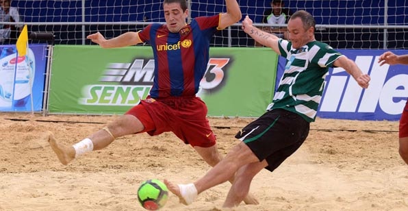 A equipa do Sporting qualificou-se para as meias-finais do Mundialito de futebol de praia , vencendo o Barcelona, por 4-2.