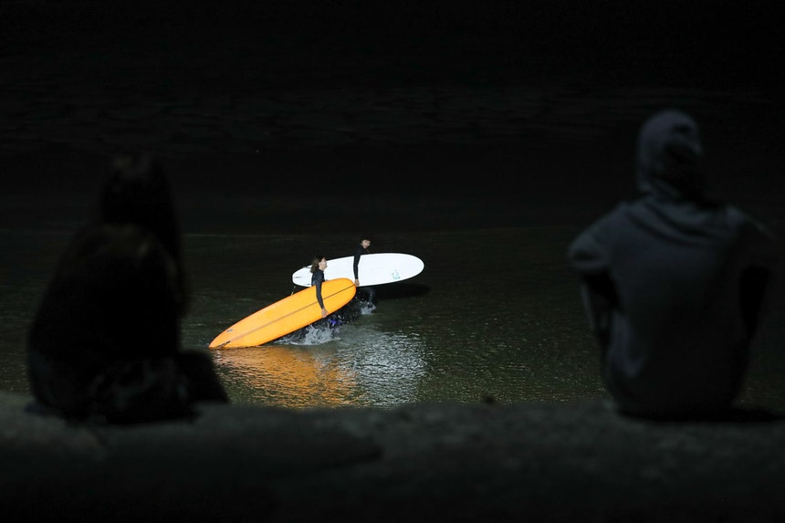 O mar, na sexta-feira, não ajudou. Com a rebentação mais longe da praia, os surfistas tiveram que entrar nas ondas numa zona pouco iluminada.