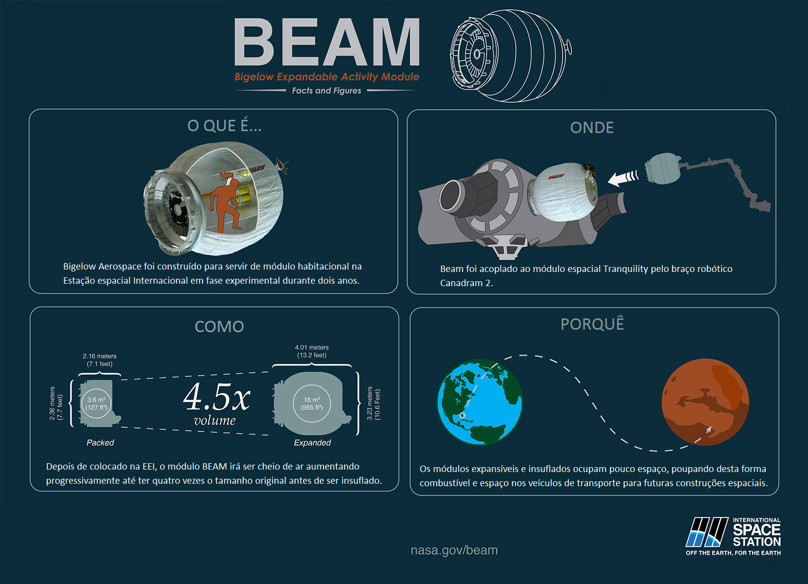 - O BEAM está acoplado à secção traseira do nó do modulo espacial americano “Tranquility” na Estação Espacial Internacional.