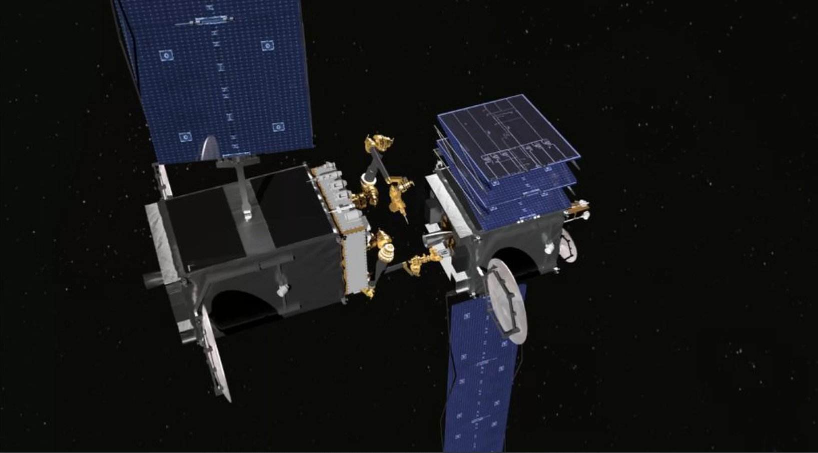Ilustração gráfica de um satélite a inspecionar outro. Crédito: SSL/DR