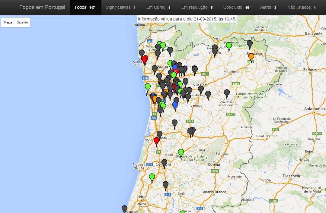 Focos de incêndio ativos ou já extintos, os meios mobilizados para cada um dos focos e, naturalmente, a respetiva localização geográfica são apenas alguns dos dados disponibilizados diretamente sobre o mapa do país pelo site de João Pina, de 27 anos, estudante da Universidade de Aveiro (UA).