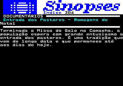 304_0001.htm 314.1. Índice. 304. DOCUMENTÁRIOS. Entrada dos Pastores - Romagens de.NatalTerminada a Missa do Galo na Camacha, apopulação espera com grande entusiasmo aentrada dos pastores. É uma tradição quevem de longa data e que permanece atéaos dias de hoje.